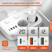 Stopcontact tekort op je bureau of naast je bank? Gebruik deze verdeelstekker als stekkerdoos met usb om een extra stopcontact te creëren of als oplaadstation met 3 usb poorten en een usb-c snellader poort. De stekkerdoos met schakelaar heeft voor iedere onderdeel een aparte aan/uit knop waardoor je zelf bepaalt waar de stroom naartoe gaat. De stopcontact splitter ondersteunt maximaal 2500W waardoor je het kan gebruiken voor bijna alle apparaten zoals een stofzuiger, wasdroger, vaatwasser, tv, computer, koelkast en veel meer!